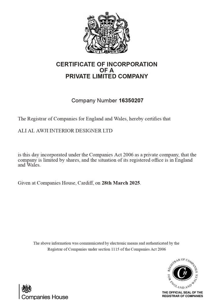 ALI AL AWJI INTERIOR DESIGNER LTD IS A COMPANY REGISTERED 16350207 IN ENGLAND & WALES
